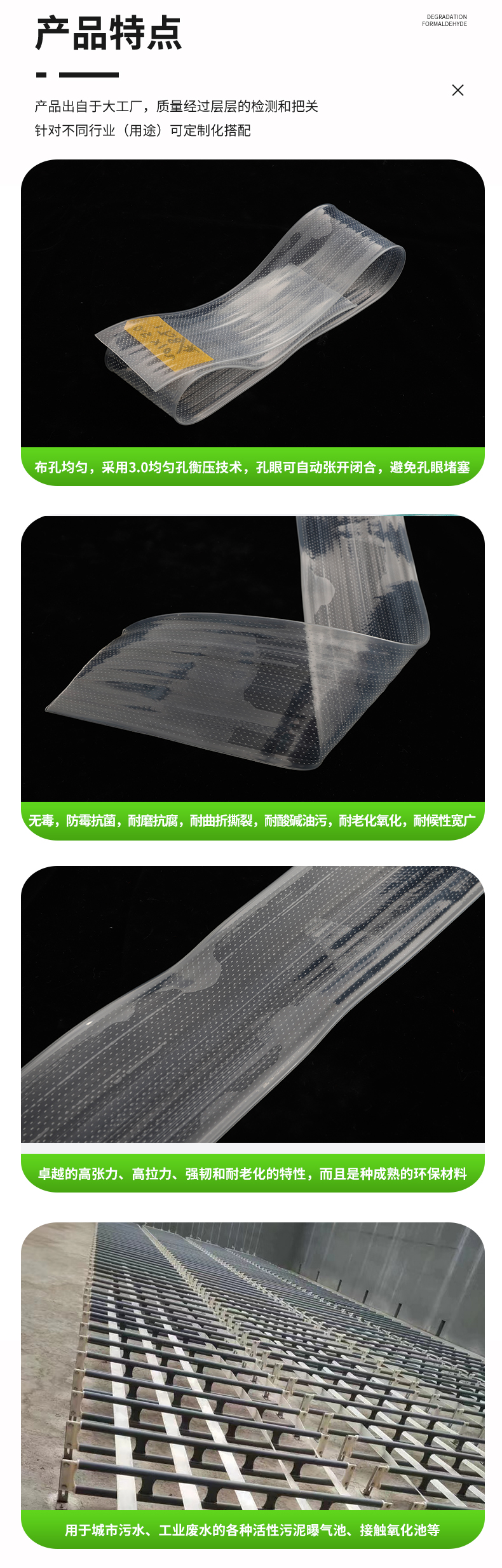 曝氣軟管是引進(jìn)西德技術(shù)開發(fā)成功的新型增氧曝氣器。薄壁、直通道極大降低了曝氣阻力損失;可變孔及狹縫自動(dòng)開閉,徹底解決了曝氣器的堵塞問題;軟管為線狀曝氣,使布?xì)饩鶆,并形成豎向環(huán)流,攪拌混合更均勻;氣泡小,氧利用率和動(dòng)力效率高。
