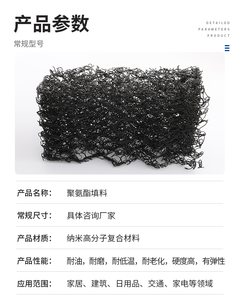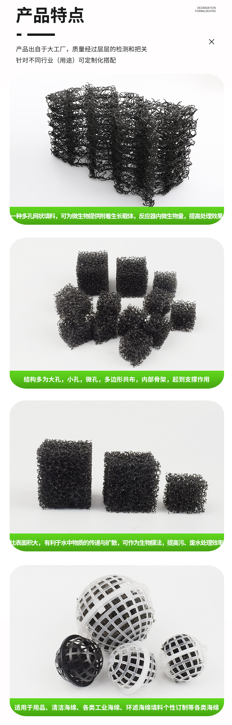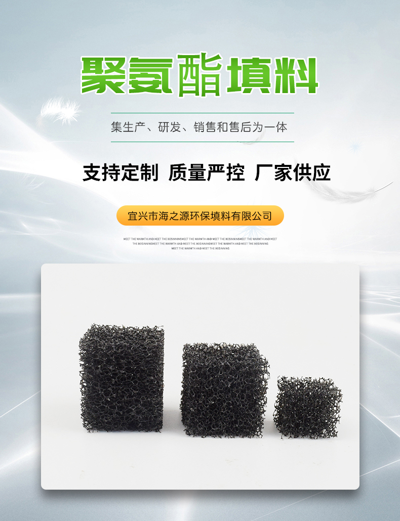 聚氨酯填料作為一種多孔網(wǎng)狀填料,可為微生物提供附著生長載體,反應器內微生物量,提高處理效果。聚氨酯填料孔隙為網(wǎng)狀,內部具體結構多為大孔,小孔,微孔,多邊形共布,通過經(jīng)絡使得面與面相交,且構成填料的內部骨架,起到支撐作用。。聚氨酯填料相比其他填料具有較大的比表面積,孔隙率可達95%以上,有利于水中物質的傳遞與擴散,可作為生物膜法,提高污、廢水處理效率,是一種較為理想的生化污水處理填料。