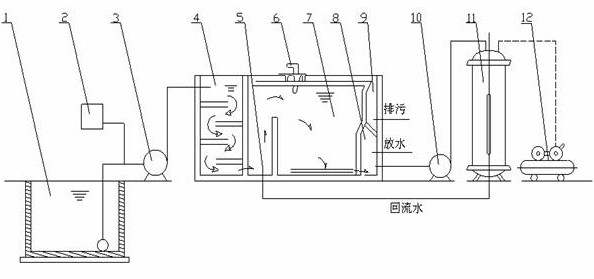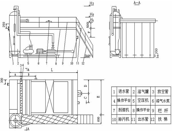 氣浮裝置的工作原理是在一定條件下,將大量空氣溶于水中,形成溶氣水,作為工作介質(zhì),通過(guò)釋放器驟然減壓,快速釋放,產(chǎn)生大量微細(xì)氣泡粘附于經(jīng)過(guò)混凝反應(yīng)后廢水中的“礬花”上,使絮體上浮,同時(shí)用刮渣機(jī)刮除,從而迅速地除去水中的污染物質(zhì),達(dá)到凈水的目的。 產(chǎn)品特點(diǎn) 1、裝置廣泛應(yīng)用于造紙、印染、制革、電鍍、紡織、石油、化工、食品等相對(duì)領(lǐng)域; 2、在給排水處理工藝中對(duì)固液、液液和比重近于水的微小懸浮物的進(jìn)行去除; 3、占地面積小,單位面積產(chǎn)水量高,渣體含水率低; 4、溶入的氣體經(jīng)驟然減壓釋放,產(chǎn)生的氣泡不僅微細(xì)、粒度均勻,密度大,而且上浮穩(wěn)定,對(duì)液體擾動(dòng)微小,特別適用于對(duì)疏松絮凝體、細(xì)小顆粒的固液分離; 5、加壓條件下,空氣溶解度大,供氣浮用的氣泡數(shù)量多,能夠確保氣浮效果; 6、部分回流式處理效果顯著、穩(wěn)定、并能較大的節(jié)約能耗; 7、工藝過(guò)程及設(shè)備簡(jiǎn)單、造價(jià)低、便于管理和維護(hù); 8、設(shè)備調(diào)試后,正常運(yùn)行可達(dá)到自動(dòng)化無(wú)人管理狀態(tài)。 適用范圍 1、電鍍廢水重金屬離子,如鉻、鋅、銅、鎳、鉛等總含量在50ppm以下,去除率均70%以上; 2、印染廢水的色度去除達(dá)90%左右,COD去除率達(dá)60~70%左右,BOD去除率達(dá)50%左右; 3、食品屠宰和制革廢水的COD去除率達(dá)70%左右,懸浮固體去除率達(dá)90%左右; 4、煉油廢水的油脂,可降到10mg/L以下,廢水能達(dá)到澄清程度; 5、對(duì)化工廢水和顏料油漆等,COD去除率達(dá)74%,色度去除率達(dá)93%左右; 6、造紙白水的纖維回收率可達(dá)95%左右,COD去除率達(dá)86.7%左右,清水完全回用; 7、大池沐浴水濁度可穩(wěn)定在10℃以下,水中的細(xì)菌有較大幅度下降; 8、生活飲用水及工業(yè)的濁度可凈化的5℃以下,同時(shí)對(duì)色度耗氧量降低有良好的效果。 工藝說(shuō)明 本設(shè)備的工作方法屬于加壓溶氣氣浮法,其工作原理:在一定條件下,將大量的空氣溶于水,形成溶氣水,作為工作介質(zhì),通過(guò)釋放驟然減壓,快速釋放,產(chǎn)生大量的微細(xì)氣泡,粘附于經(jīng)過(guò)混凝反應(yīng)后的廢水中的"礬花"上,使絮體上浮進(jìn)行清除。 1. 調(diào)節(jié)池 2. 投凝劑設(shè)備 3. 污水泵 4. 折板聚凝池 5. 釋放器 6. 刮渣機(jī) 7. 氣浮池 8. 溶氣水存放池 9. 污泥池 10. 溶氣水泵 11. 溶氣罐 12. 空壓機(jī)