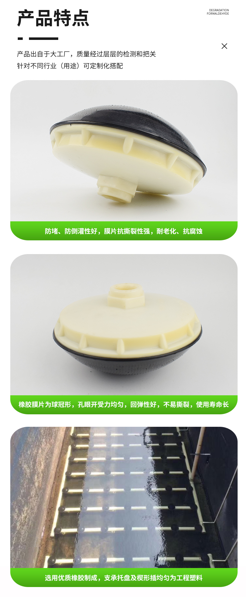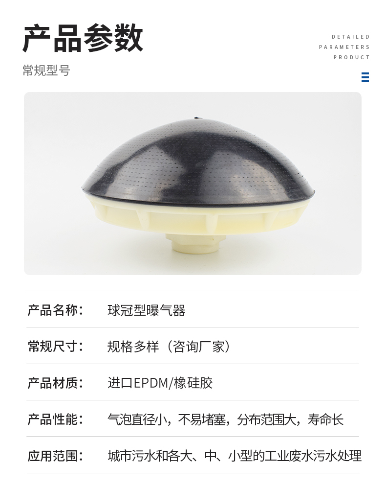 球冠bzo.w-192球冠形可張微孔曝氣器,是我廠根據污水生物處理的工藝特點,在原膜片微孔曝氣器的基礎上,進行專項研制開發(fā)的新型曝氣裝置。曝氣器整體結構科學合理、工藝先進、設計新穎、微孔曝氣膜及支承托盤呈獨特的球冠形結構。該曝氣器具有優(yōu)異的防堵及防水體倒流的性能。在間歇運行工況條件下,曝氣膜表面不易沉淀污泥。較平板膜片式微孔曝氣器使用壽命更長,充氧效率更高,也適用于源水微污染生物處理。