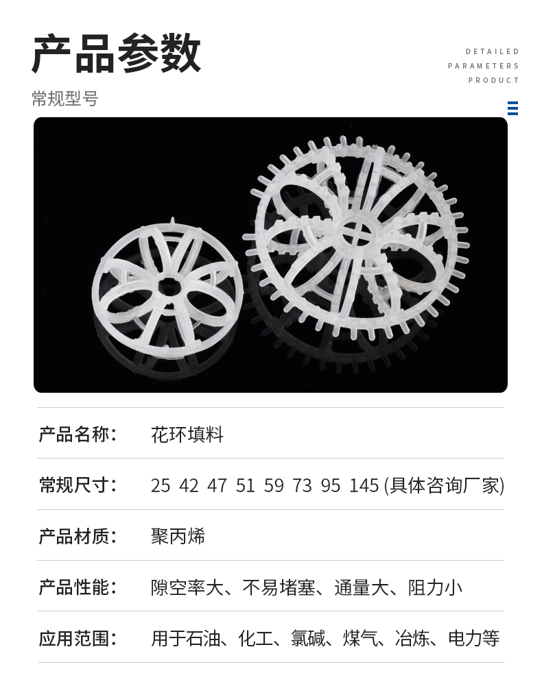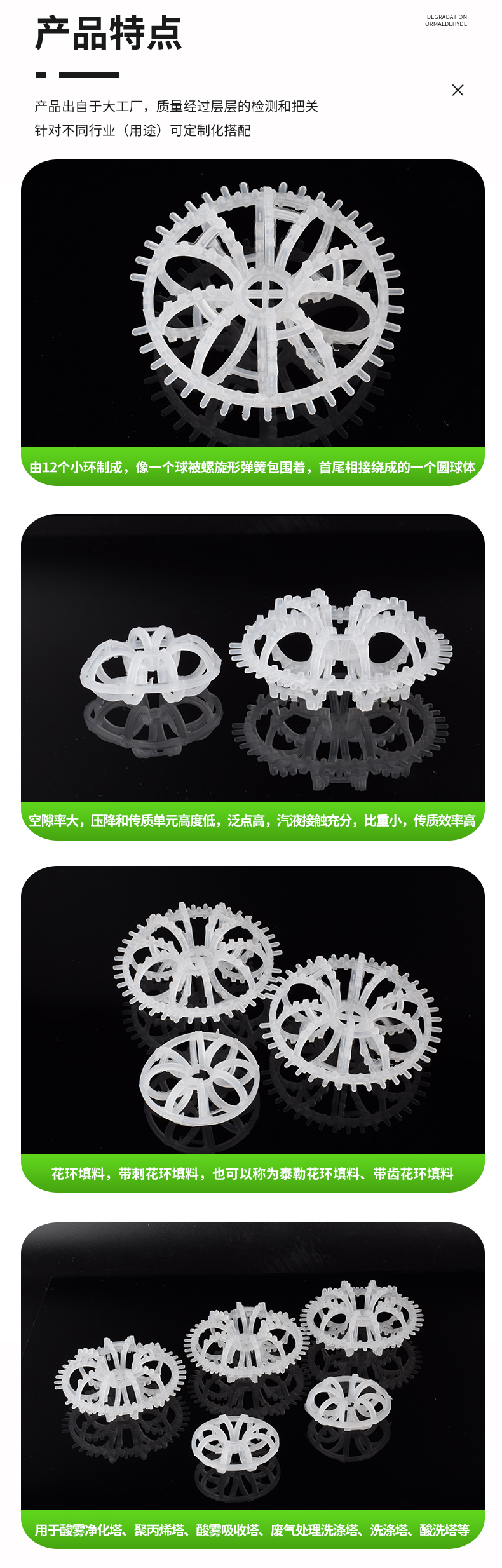 花環(huán)填料也稱梅花環(huán)填料是由許多圓環(huán)結(jié)繞而成,由于這種填料的間隙處能有較高的滯液量,可使塔內(nèi)液體停留時(shí)間較長,從而增加了氣液的接觸時(shí)間,提高了填料的傳質(zhì)效率。具有空隙率大,壓降和傳質(zhì)單元高度低,泛點(diǎn)高,汽液接觸充分,比重小,傳質(zhì)效率高等特點(diǎn),多用于氣體洗滌、凈化塔中。