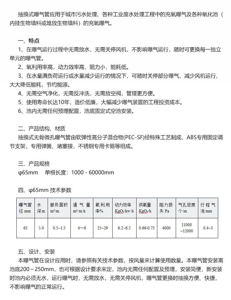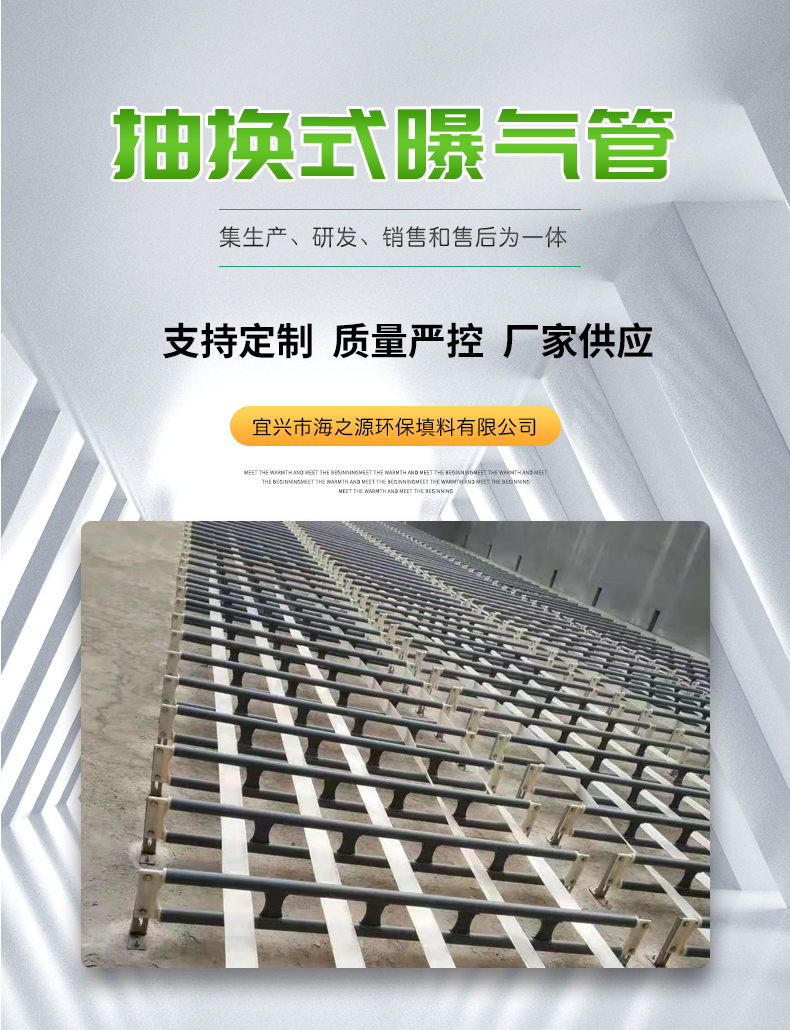 抽換式無骨微孔曝氣管由軟彈性高分子混合物(PEC-SF)經特殊工藝制成,ABS專用固定調節(jié)支架,專用彈簧、堵塞接,不銹鋼專用卡箍等組成。