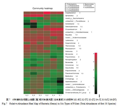 為進(jìn)一步揭示其群落結(jié)構(gòu)差異,基于細(xì)菌菌門水平(圖6)、變形菌門(表3)及菌屬水平(圖7)分析生物膜上的微生物群落結(jié)構(gòu)組成。由圖6可知,從菌門水平來看,不同填料反應(yīng)器中微生物群落組成的差異不是特別大。6種填料生物膜樣本的主要菌群均為變形菌門(Proteobacteria)、擬桿菌門(Bacteroidetes)、厚壁菌門(Firmicutes)及放線菌門(Actinobacteria)。以MT反應(yīng)器為例,其生物膜樣本變形菌門占比達(dá)56.2%,其次是擬桿菌門(25.3%)、厚壁菌門(14.8%)。其他5種填料生物膜樣本上的變形菌門占比介于28%~54.3%,擬桿菌門占比介于23.5%~57.3%,厚壁菌門介于9.2%~16.1%。該結(jié)果與前人研究結(jié)果相近,如Ma等[21]在序批式反應(yīng)器中發(fā)現(xiàn)的細(xì)菌群落組成中變形菌門(占比最大)、擬桿菌門及放線菌門占優(yōu)勢(shì);Snaidr等[22]在常規(guī)活性污泥中對(duì)菌群多樣性的研究中發(fā)現(xiàn)變形菌門(Proteobacteria)為優(yōu)勢(shì)類群。在6個(gè)樣品中還有綠彎菌門(Chloroflexi)、浮酶菌門(Planctomycetes)、綠菌門(Chlorobi)及單胞菌門(Gemmatimonadetes)等,但所占比例均不同。其中綠菌門在顆粒化過程中有重要作用,能夠增強(qiáng)污泥的沉降性能。